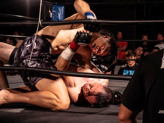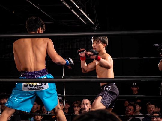 間合いの取り合いから、パンチ、ヒザを的確に当てダメージを重ねる。