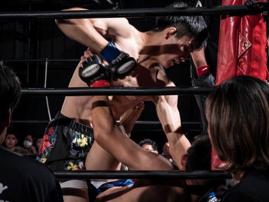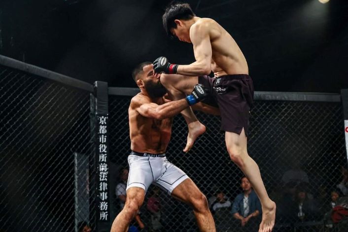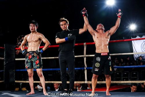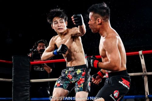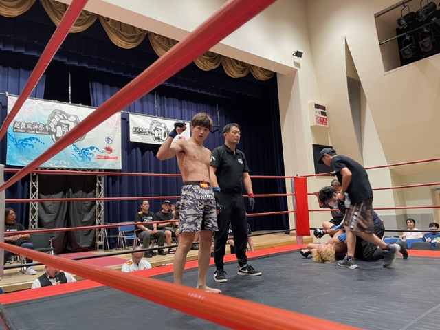 間合いの取り合いから、パンチ、ヒザを的確に当てダメージを重ねる。